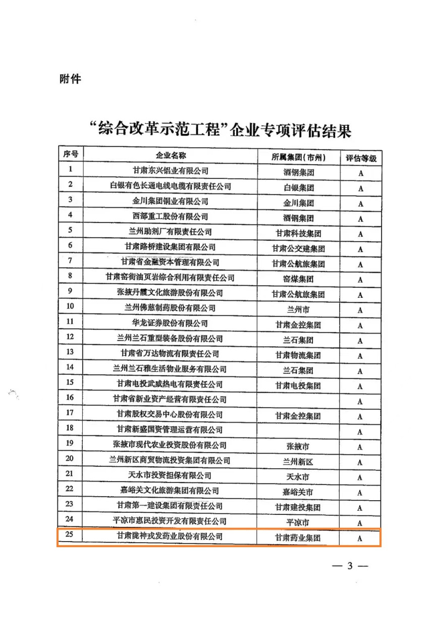 2019年,甘肅省國資國企改革推進(jìn)工作領(lǐng)導(dǎo)小組辦公室在全省遴選40戶省屬及省屬二級(jí)企業(yè)和14戶市屬企業(yè),利用三年時(shí)間,深入開展“綜合改革示范工程”,全面落實(shí)國企改革“1+N”政策文件,緊緊圍繞“五突破一加強(qiáng)”綜合施策深入推進(jìn)改革。近日,經(jīng)甘肅省國資國企改革推進(jìn)工作領(lǐng)導(dǎo)小組辦公室會(huì)議研究審定,甘肅隴神戎發(fā)藥業(yè)股份有限公司在“綜合改革示范工程”專項(xiàng)評(píng)估中榮獲A級(jí)評(píng)定。
