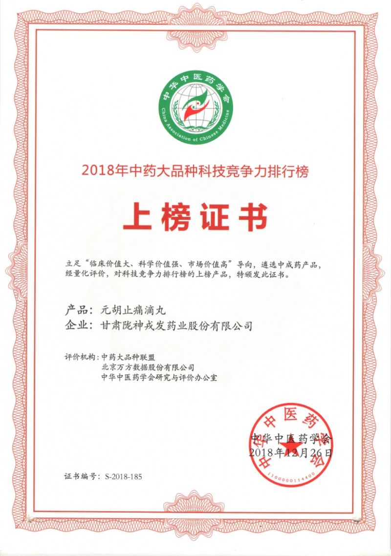2018年12月26日,“第四屆中藥大品種聯(lián)盟論壇暨中藥大品種科技競爭力排行榜發(fā)布會”在北京召開。隴神戎發(fā)獨家產(chǎn)品元胡止痛滴丸成功上榜,并在 《甘肅省中藥大品種科技競爭力排行榜》(省區(qū)榜單)和《神經(jīng)系統(tǒng)用藥中藥大品種科技競爭力榜》(治療領(lǐng)域榜單)兩大榜單中分別位列第三名和第九名。