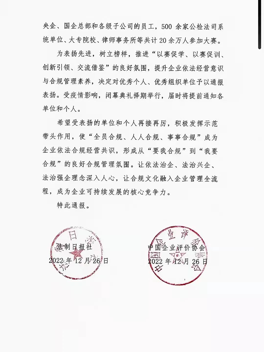 2022年12月26日甘肅藥業(yè)投資集團(tuán)有限公司獲得由法治日?qǐng)?bào)社及中國(guó)企業(yè)評(píng)價(jià)協(xié)會(huì)頒發(fā)的“2022首屆全國(guó)企業(yè)合規(guī)知識(shí)大賽”優(yōu)秀組織單位獎(jiǎng)。