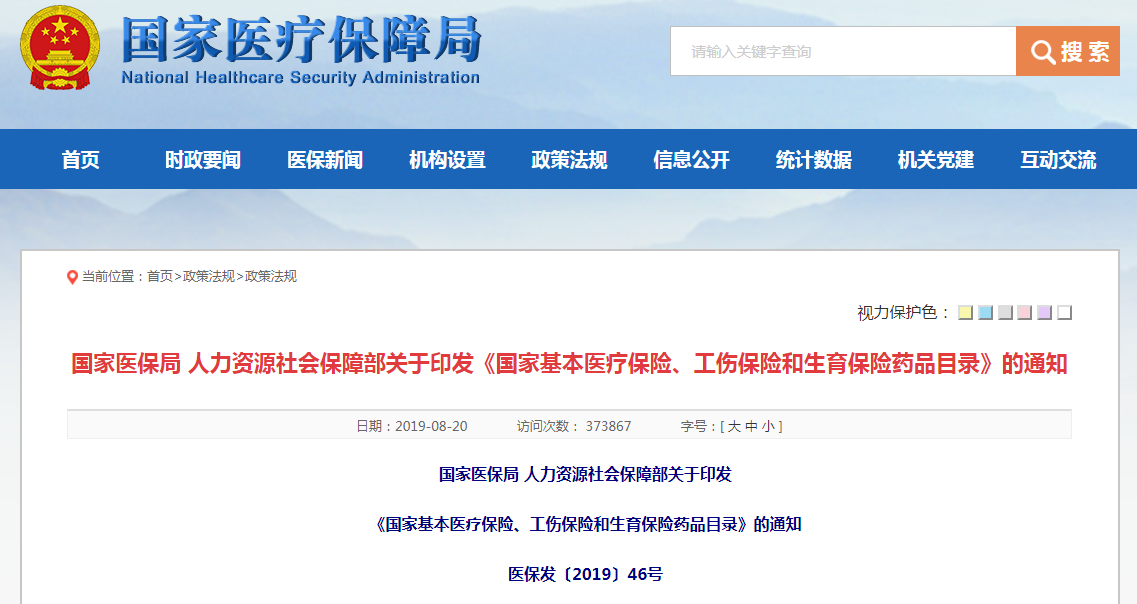 國家醫(yī)保局 人力資源社會保障部關(guān)于印發(fā) 《國家基本醫(yī)療保險、工傷保險和生育保險藥品目錄》的通知 醫(yī)保發(fā)〔2019〕46號