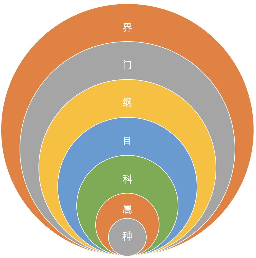 一般在生物學上,按照階元系統(tǒng)進行分類,通常包括七個主要級別:界、門、綱、目、科、屬、種。種是基本單元。從界到種,范圍逐步縮小。