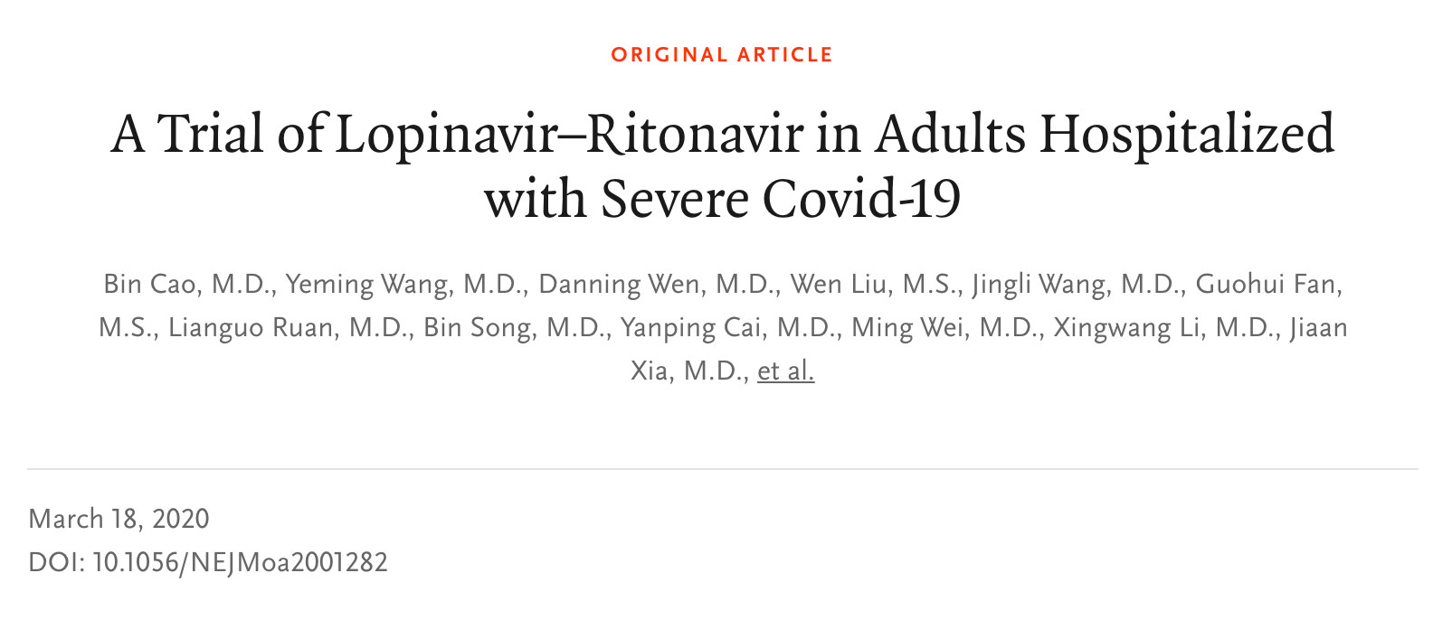 3月18日,眾所期待的洛匹那韋-利托那韋治療新冠臨床試驗結(jié)果,在《新英格蘭醫(yī)學雜志》上發(fā)布,結(jié)果讓人失望,在重癥患者中,與常規(guī)治療相比,研究未能觀察到洛匹那韋-利托那韋治療的有效性。