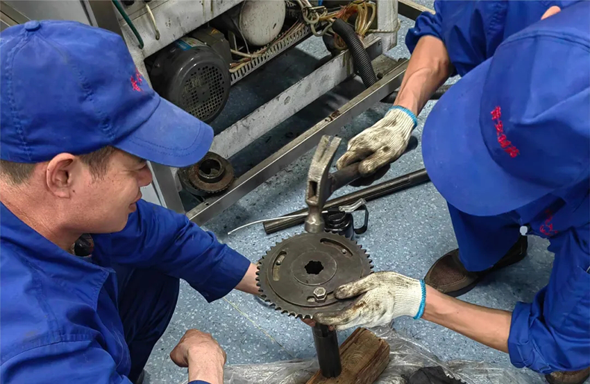 今年3月22日,外包車間原本正常運行的4號線裝盒機(jī)突然發(fā)出與平時不一樣的“呼喊聲”,忙碌在生產(chǎn)線的班長楊禧和滿天雁察覺不對,急忙來到故障設(shè)備處,發(fā)現(xiàn)裝盒機(jī)運行不暢,出現(xiàn)夾盒現(xiàn)象,導(dǎo)致產(chǎn)品破損增加,于是馬上通知4號線裝盒工段停機(jī),對故障設(shè)備進(jìn)行拆解維修。經(jīng)過多次查找探討后,最終發(fā)現(xiàn)因裝盒機(jī)運行時間過長導(dǎo)致鏈盤輪固定螺絲滑絲,鏈條移位。為盡快恢復(fù)生產(chǎn),二人齊心協(xié)力,廢寢忘食,埋頭于拆解零件修理設(shè)備之間,經(jīng)過不懈努力終于將設(shè)備修復(fù),恢復(fù)正常生產(chǎn),有效控制了質(zhì)量成本。不知不覺過去了6個小時,這是生產(chǎn)現(xiàn)場平凡又緊張的一幕。