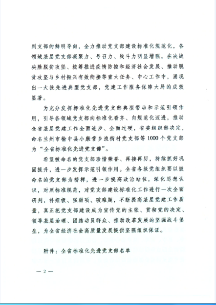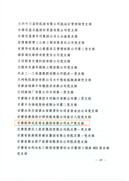 近日,甘肅省委組織部印發(fā)《關(guān)于命名1000個(gè)全省標(biāo)準(zhǔn)化先進(jìn)黨支部的通知》,對在決戰(zhàn)決勝脫貧攻堅(jiān)、統(tǒng)籌推進(jìn)疫情防控和經(jīng)濟(jì)社會發(fā)展、推動脫貧攻堅(jiān)與鄉(xiāng)村振興有效銜接等重大任務(wù)、中心工作中涌現(xiàn)出的1000個(gè)標(biāo)準(zhǔn)化先進(jìn)黨支部進(jìn)行了命名。甘肅隴神戎發(fā)藥業(yè)股份有限公司所屬生產(chǎn)黨支部光榮上榜。