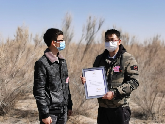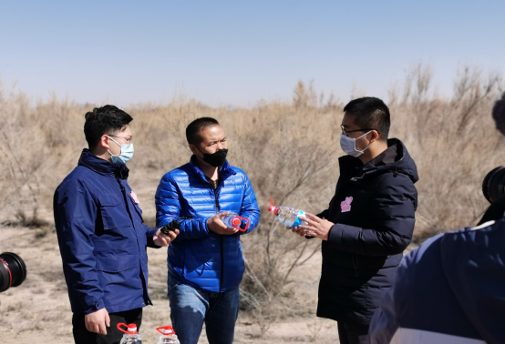 2020年3月16日,甘肅隴神戎發(fā)藥業(yè)股份有限公司志愿者一行4人與甘肅衛(wèi)視《好人在身邊》欄目組驅(qū)車(chē)400多公里,來(lái)到位于甘肅省武威市民勤縣的騰格里沙漠最西端,在一望無(wú)際的沙漠戈壁中學(xué)習(xí)打草格、種梭梭樹(shù),感受了治沙志愿者為民勤的治沙事業(yè)所付出的艱辛勞動(dòng)。公司副總經(jīng)理錢(qián)雙喜代表隴神戎發(fā)為“青梭公益”的志愿者捐贈(zèng)公司生產(chǎn)的75%的乙醇消毒液,用于治沙志愿者在治沙過(guò)程中人員和器皿的消毒。
