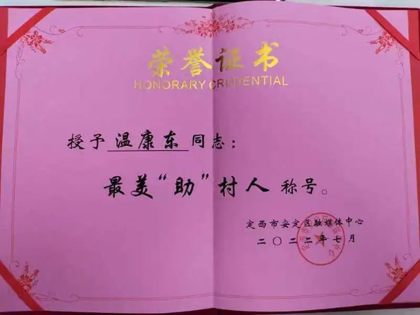 溫康東自2021年9月?lián)味ㄎ魇邪捕▍^(qū)李家堡鎮(zhèn)紅川村第一書記、幫扶工作隊(duì)隊(duì)長以來,他堅(jiān)持立足平凡崗位,踐行志愿精神,不惜拋灑青春,為山區(qū)奉獻(xiàn)青春,用自己的“辛苦指數(shù)”換來群眾的“幸福指數(shù)”,他的真情奉獻(xiàn)贏得了身邊黨員群眾的一致好評(píng),是公認(rèn)的志愿榜樣,2022年被評(píng)選為定西市安定區(qū)“最美助村人”,2023年被定西市2022年度學(xué)雷鋒志愿服務(wù)先進(jìn)典型評(píng)選工作小組評(píng)選為定西市“疫情防控優(yōu)秀志愿者”。