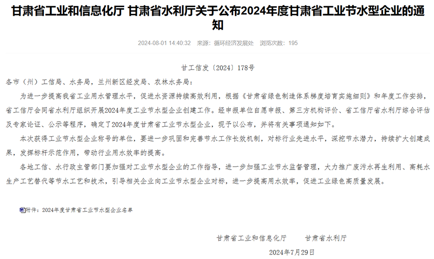 近日,省工信廳和省水利廳聯(lián)合發(fā)文,表彰了一批2024年甘肅省工業(yè)節(jié)水型企業(yè),我公司榜上有名,榮獲“甘肅省工業(yè)節(jié)水型企業(yè)”稱號(hào)。
