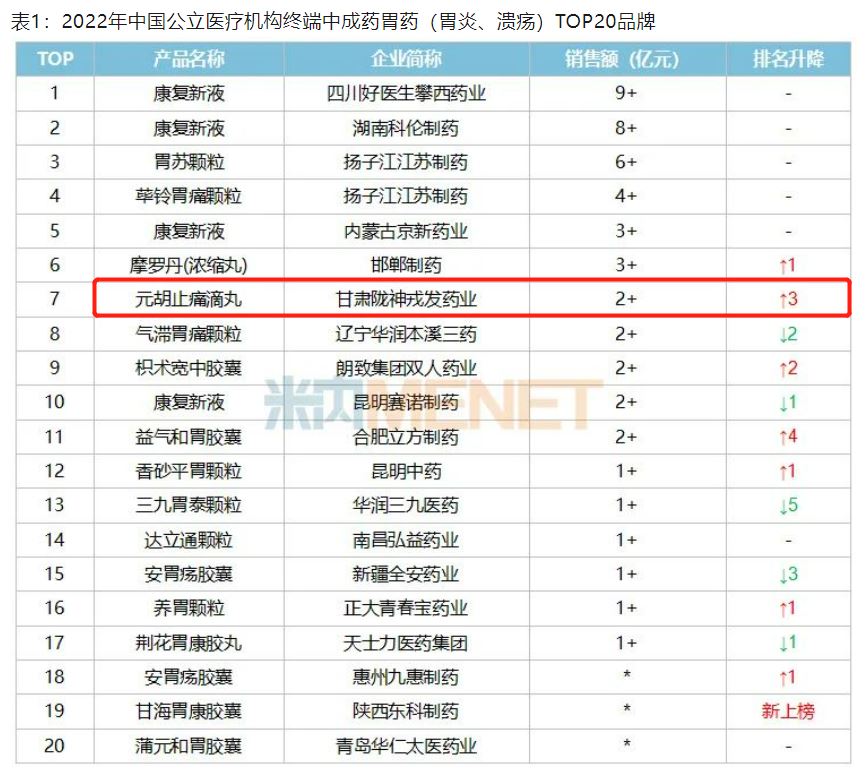 據(jù)統(tǒng)計(jì),我國(guó)胃腸疾病患者有1.2億人,且發(fā)病率越來(lái)越高。據(jù)米內(nèi)網(wǎng)最新數(shù)據(jù)顯示,2022年中國(guó)公立醫(yī)療機(jī)構(gòu)終端中成藥胃藥(胃炎、潰瘍)銷(xiāo)售額保持在70億元水平。其中甘肅隴神戎發(fā)藥業(yè)的元胡止痛滴丸銷(xiāo)售額超過(guò)2億元,在2022年中國(guó)公立醫(yī)療機(jī)構(gòu)終端中成藥胃藥(胃炎、潰瘍)TOP品牌排名第七。