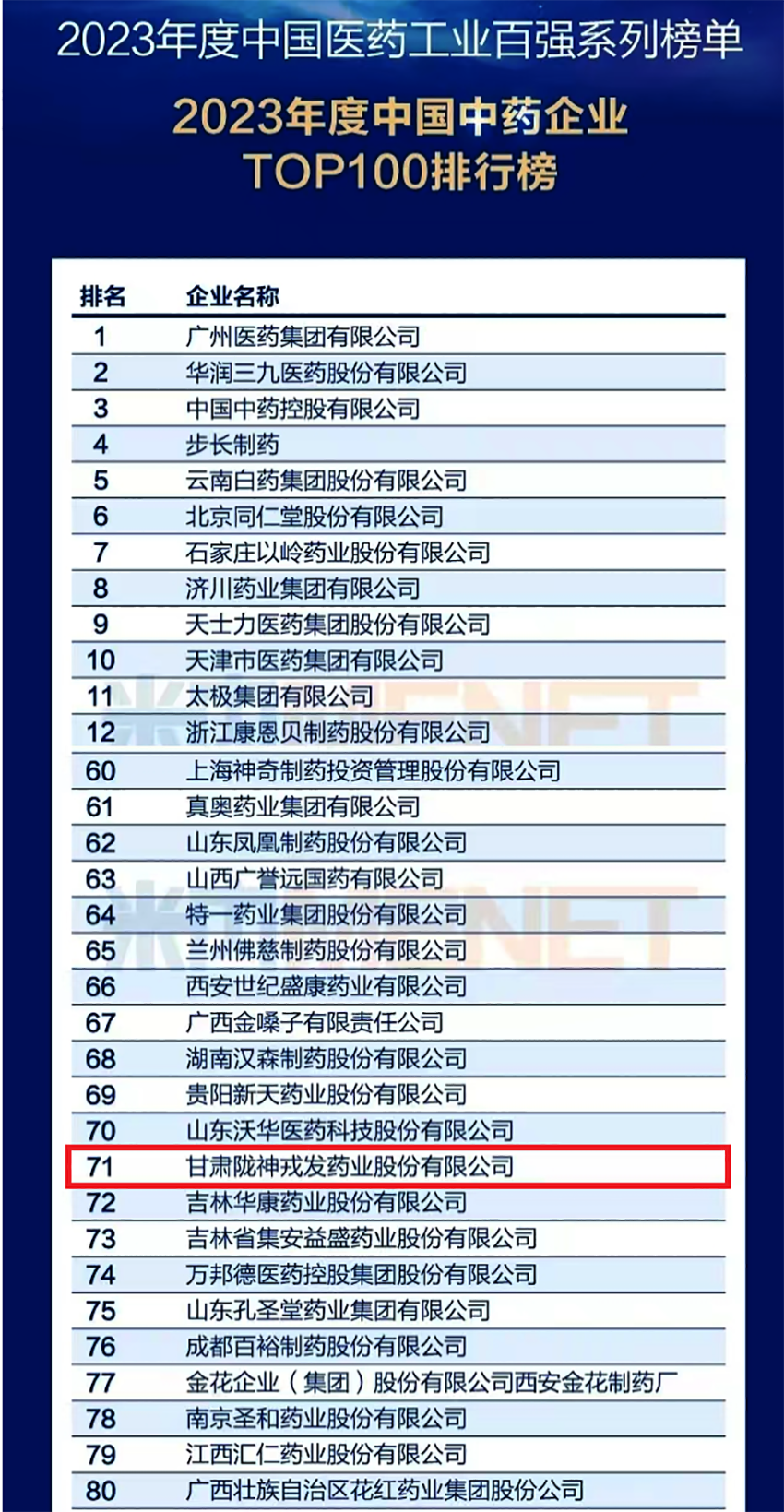 會(huì)上,“2023年度中國(guó)醫(yī)藥工業(yè)百?gòu)?qiáng)系列榜”重磅發(fā)布,共發(fā)布5大系列榜單和260家上榜企業(yè)。中國(guó)醫(yī)藥工業(yè)百?gòu)?qiáng)企業(yè)榜是國(guó)內(nèi)公認(rèn)的醫(yī)藥行業(yè)權(quán)威榜單,細(xì)分為“中國(guó)化藥企業(yè)TOP100排行榜”、“中國(guó)中藥企業(yè)TOP100排行榜”、“中國(guó)CXO企業(yè)TOP20排行榜”等5大子榜單,上榜企業(yè)是中國(guó)最具實(shí)力的醫(yī)藥工業(yè)企業(yè),代表國(guó)內(nèi)醫(yī)藥工業(yè)的發(fā)展水平,展示了中國(guó)醫(yī)藥工業(yè)百?gòu)?qiáng)企業(yè)的專(zhuān)業(yè)力和影響力。甘肅隴神戎發(fā)藥業(yè)股份有限公司首次成功入選“2023年度中國(guó)中藥企業(yè) TOP100 排行榜”,位列第71位。獲此殊榮的還有同為甘肅國(guó)投集團(tuán)控股的蘭州佛慈制藥股份有限公司。