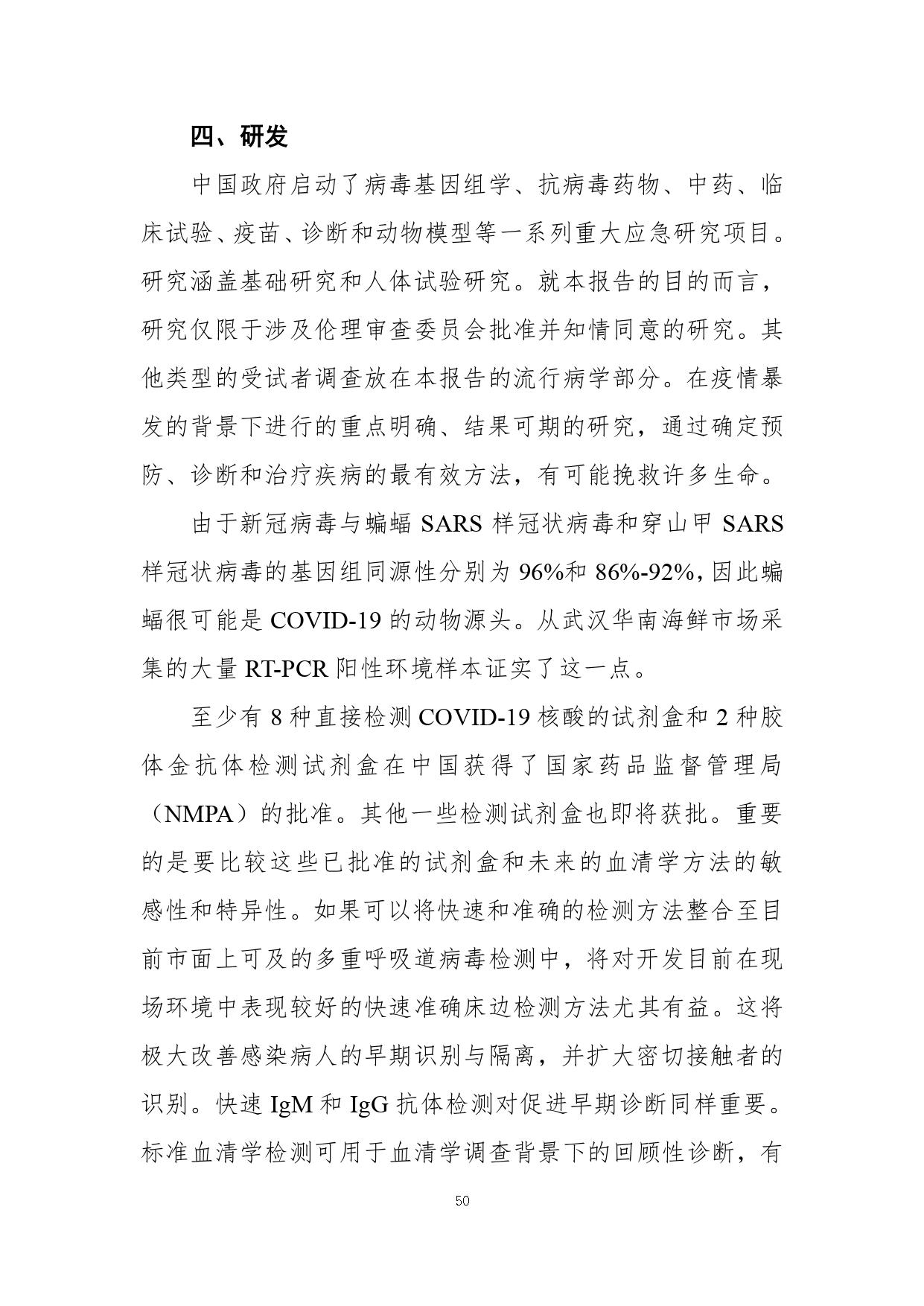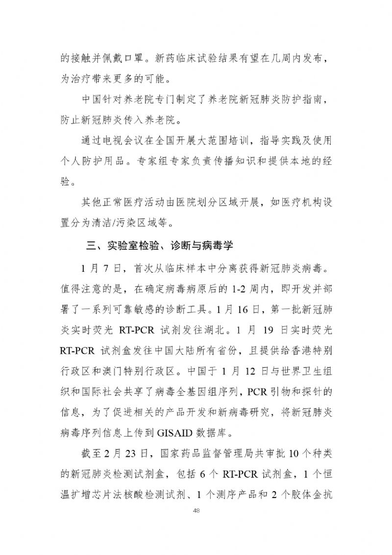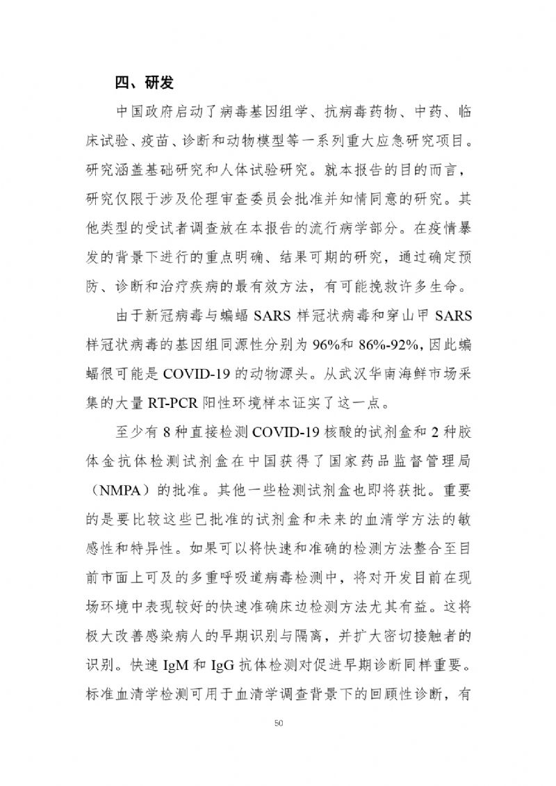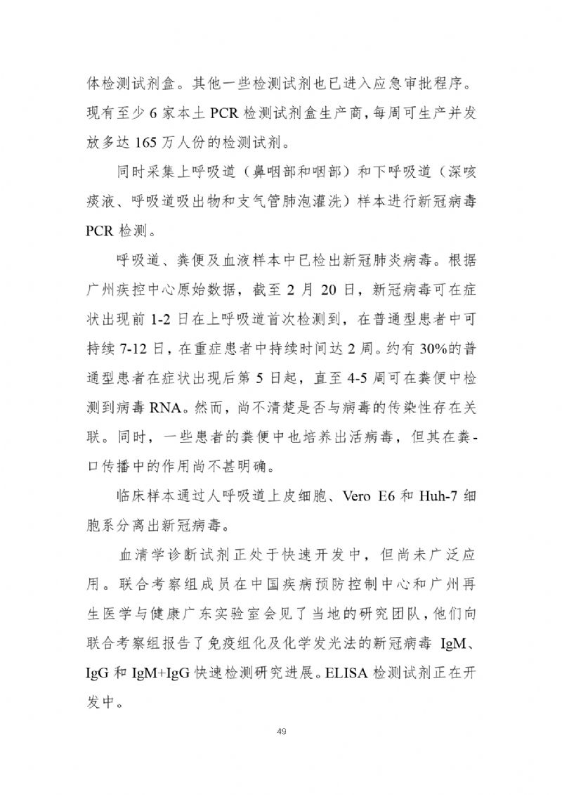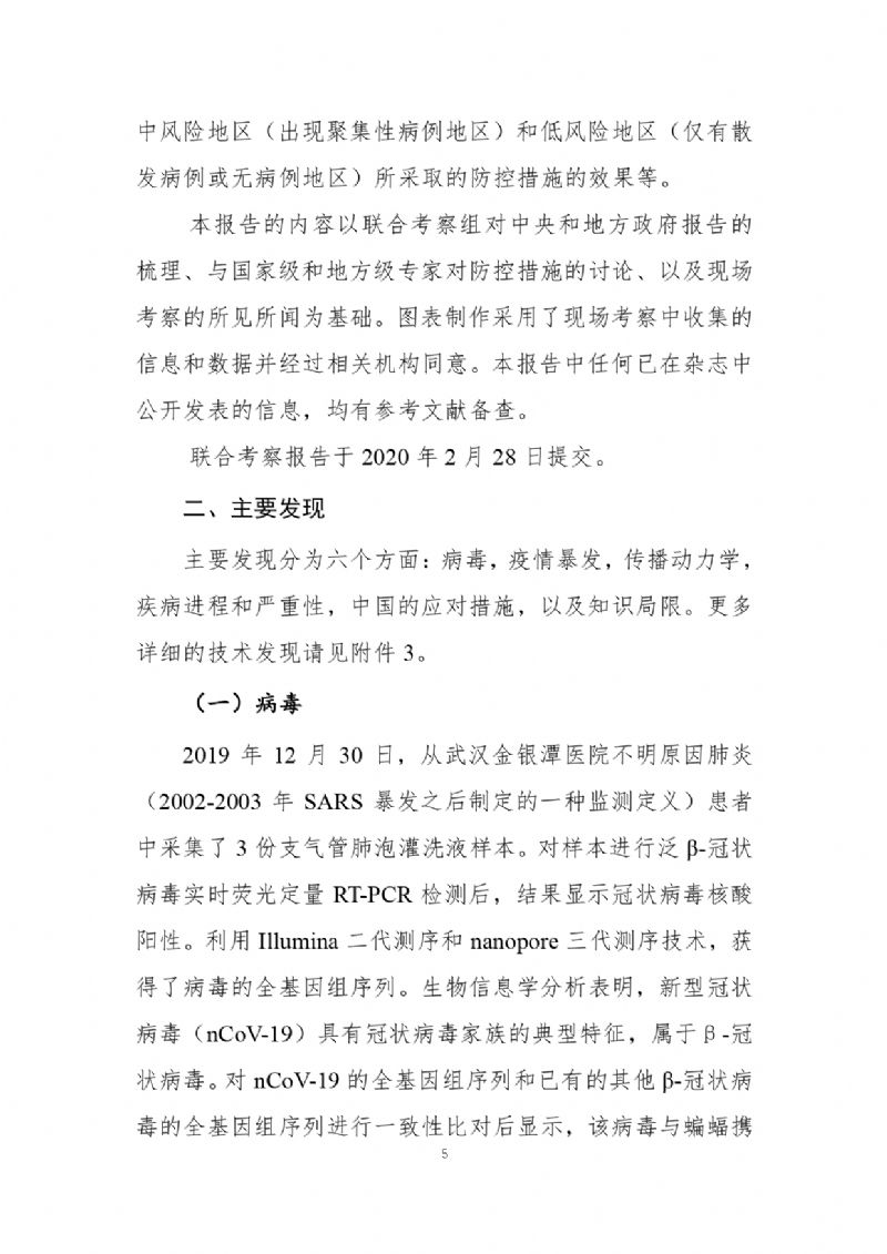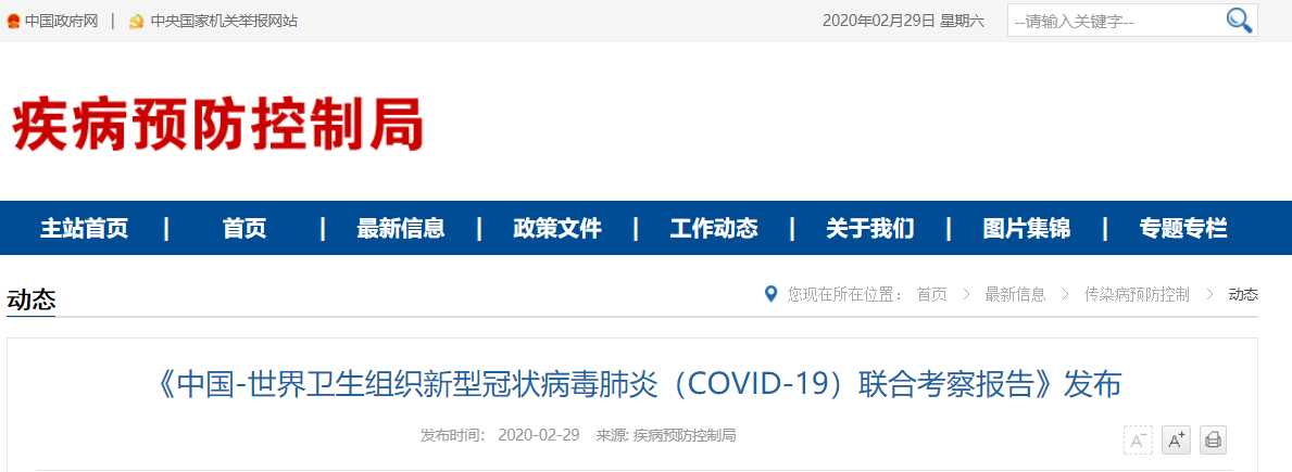 2月29日,國(guó)家疾病預(yù)防控制局發(fā)布《中國(guó)-世界衛(wèi)生組織新型冠狀病毒肺炎(COVID-19)聯(lián)合考察報(bào)告》,對(duì)重視問題、主要發(fā)現(xiàn)、中國(guó)和全球應(yīng)對(duì)措施及下一步工作進(jìn)行了闡述,并且公布了部分實(shí)驗(yàn)室檢驗(yàn)、診斷與病毒學(xué)、研發(fā)等方面詳細(xì)的技術(shù)調(diào)查結(jié)果。