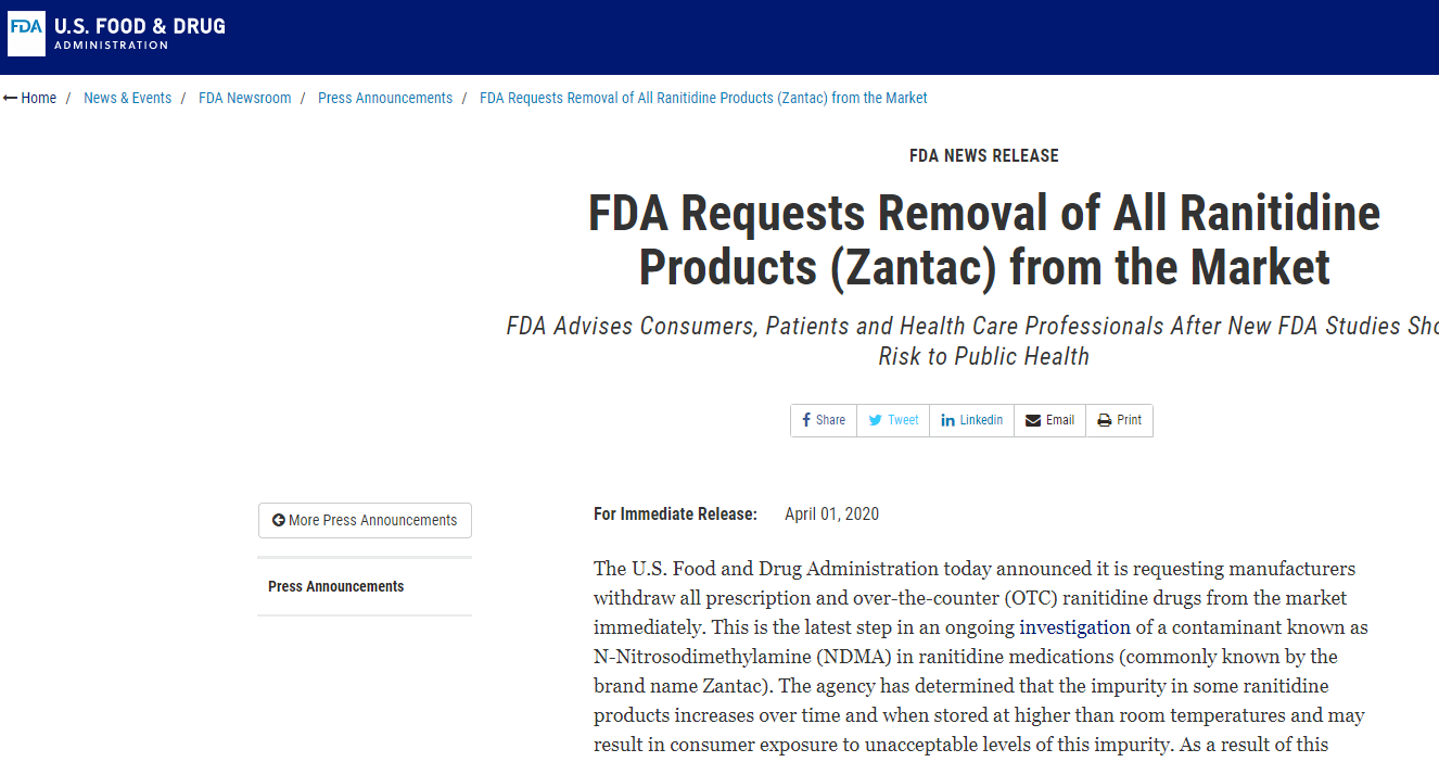 第一則聲明發(fā)布之后,F(xiàn)DA 隨后發(fā)布多次聲明分別關(guān)于召回不同廠商的雷尼替丁產(chǎn)品。而這一次的聲明是針對(duì)所有的藥企、所有的雷尼替丁藥品,無(wú)論是處方藥還是非處方藥。在FDA的對(duì)外聲明中,用了「immediately」、「all」等詞匯,根據(jù)該聲明,雷尼替丁將無(wú)法在美國(guó)銷售。
